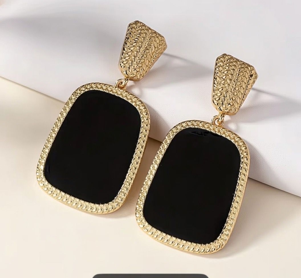 ✨ Kolczyki wiszące – prostokątne czarne z złotym plecionym rantem ✨