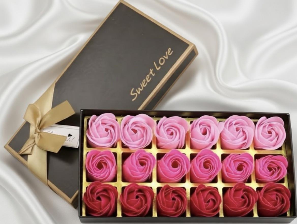 Eleganckie, czarne pudełko ze złotym wykończeniem i napisem Sweet Love skrywa 18 ręcznie robionych róż z mydła glicerynowego: