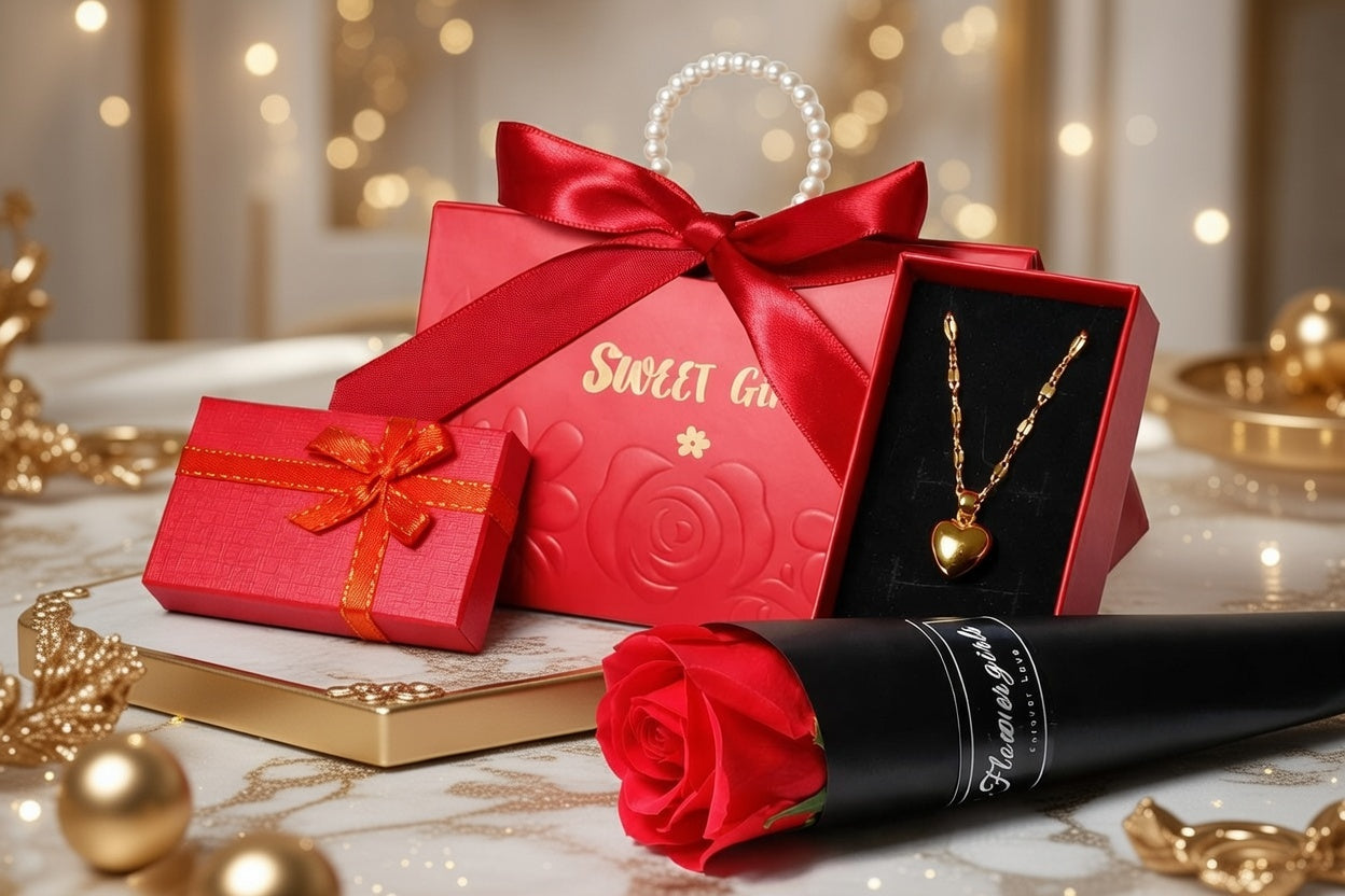 Całość dopełnia efektowna czerwona róża, symbol miłości, bliskości i emocji, zapakowana w elegancką czarną tubę. Zestaw zaprezentowany jest w stylowych, czerwonych pudełkach prezentowych z kokardą — gotowy do wręczenia bez dodatkowego pakowania.